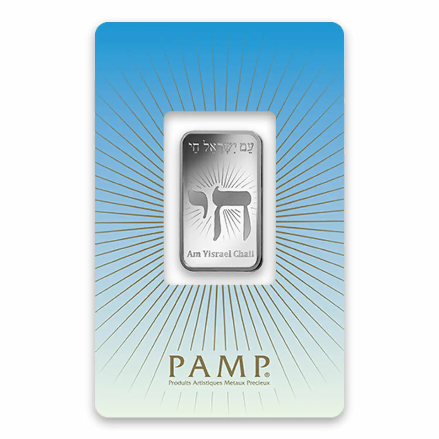 Buy the high-quality, magnificent 10g PAMP Silver Bar - Am Yisrael Chai! today from us online! The recent silver price is updated on our website every minute.