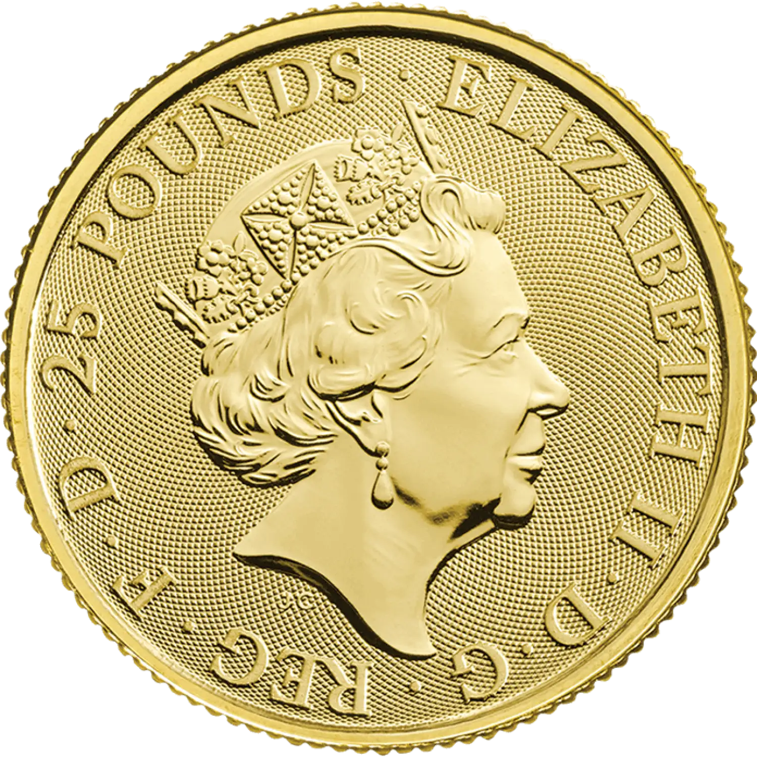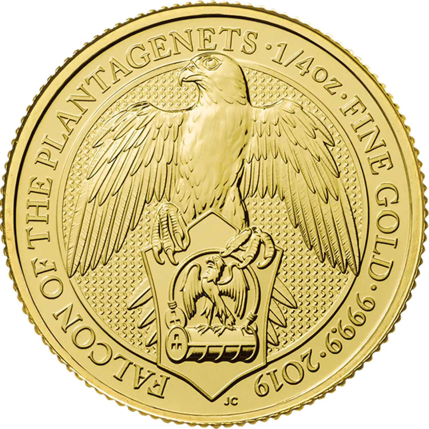 The 2019 1/4oz Britain Queen's Beast: The Falcon of the Plantagenets is the sixth release in this 10 coin "Queen's Beasts" series. The Britain Queen's Beasts celebrate the British Monarch and the centuries of fascinating heraldry. This strikingly beautiful gold coin contains 1/4 oz of .9999 fine gold. This one ounce gold bullion coin is the sixth addition to The Queen’s Beasts bullion range. Inspired by ancient symbols of power and identity, the range brings to life the ten imposing statues that lined the entrance to Westminster Abbey in 1953 at the coronation of Her Majesty The Queen.