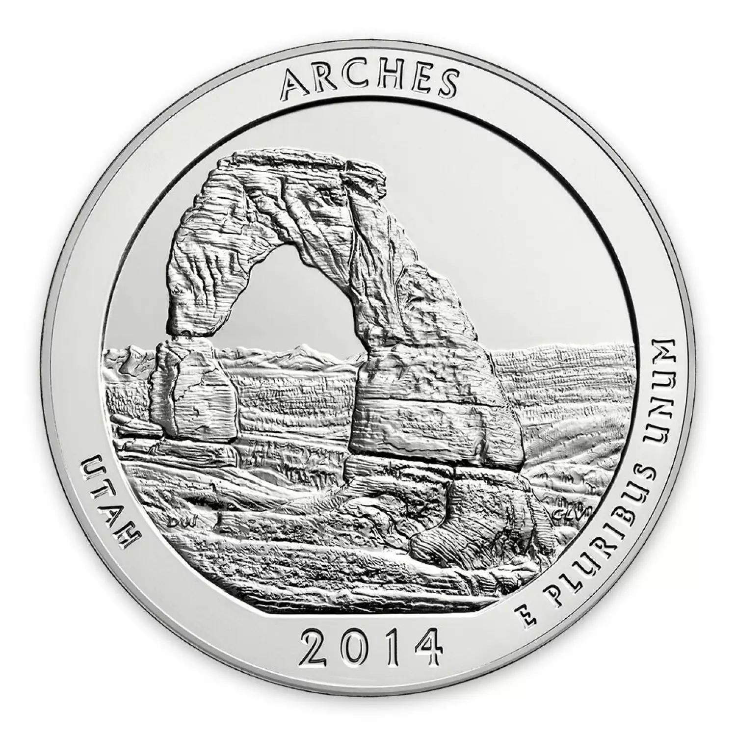 Since 2010, the US Mint released five silver America the Beautiful coins annually. The 5oz silver coins will be complete in 2021, each representing a historical monument or a treasured national park. These bullion coins were introduced following the success of the state quarter program.Arches National Park is a national park in eastern Utah, United States. The park is adjacent to the Colorado River, 4 miles (6 km) north of Moab, Utah. More than 2,000 natural sandstone arches are located in the park, including the well-known Delicate Arch, as well as a variety of unique geological resources and formations. The park contains the highest density of natural arches in the world.