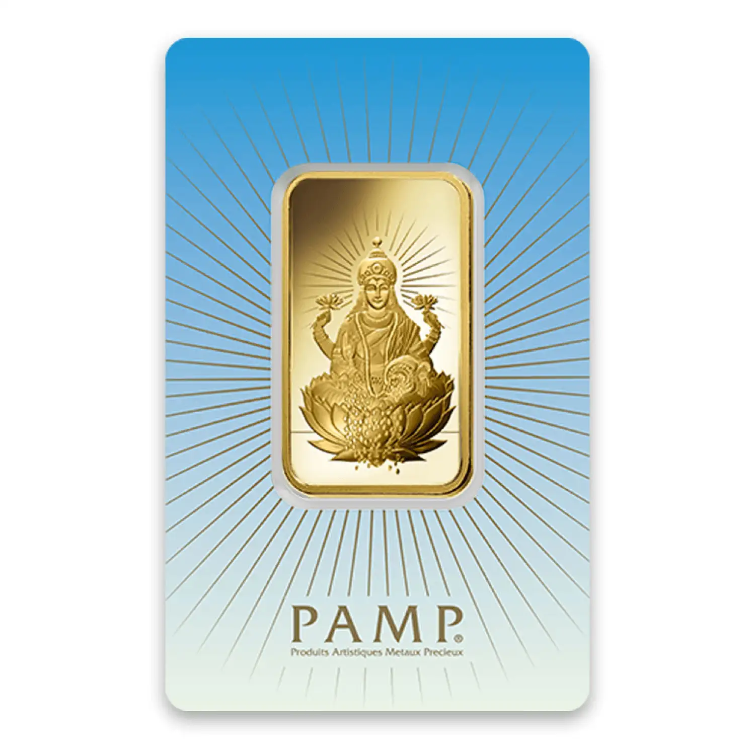 The 1oz PAMP Gold Bar - Lakshmi celebrates the Hindu faith. This gold bar features a design depicting Lakshmi - the goddess of wealth, fortune and love. The reverse of this stunning gold bar depicts the weight and purity and also the serial number unique to each bar.