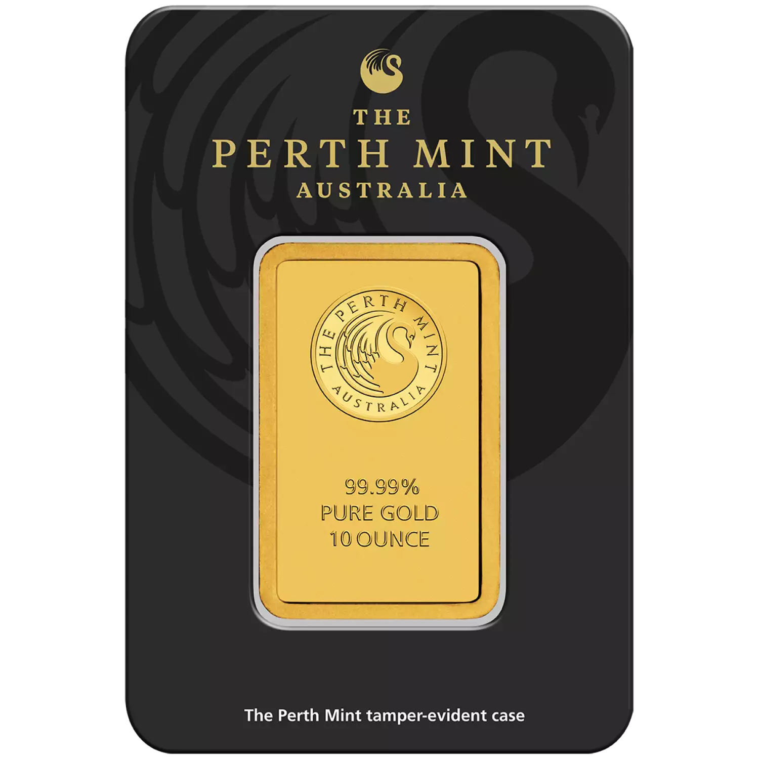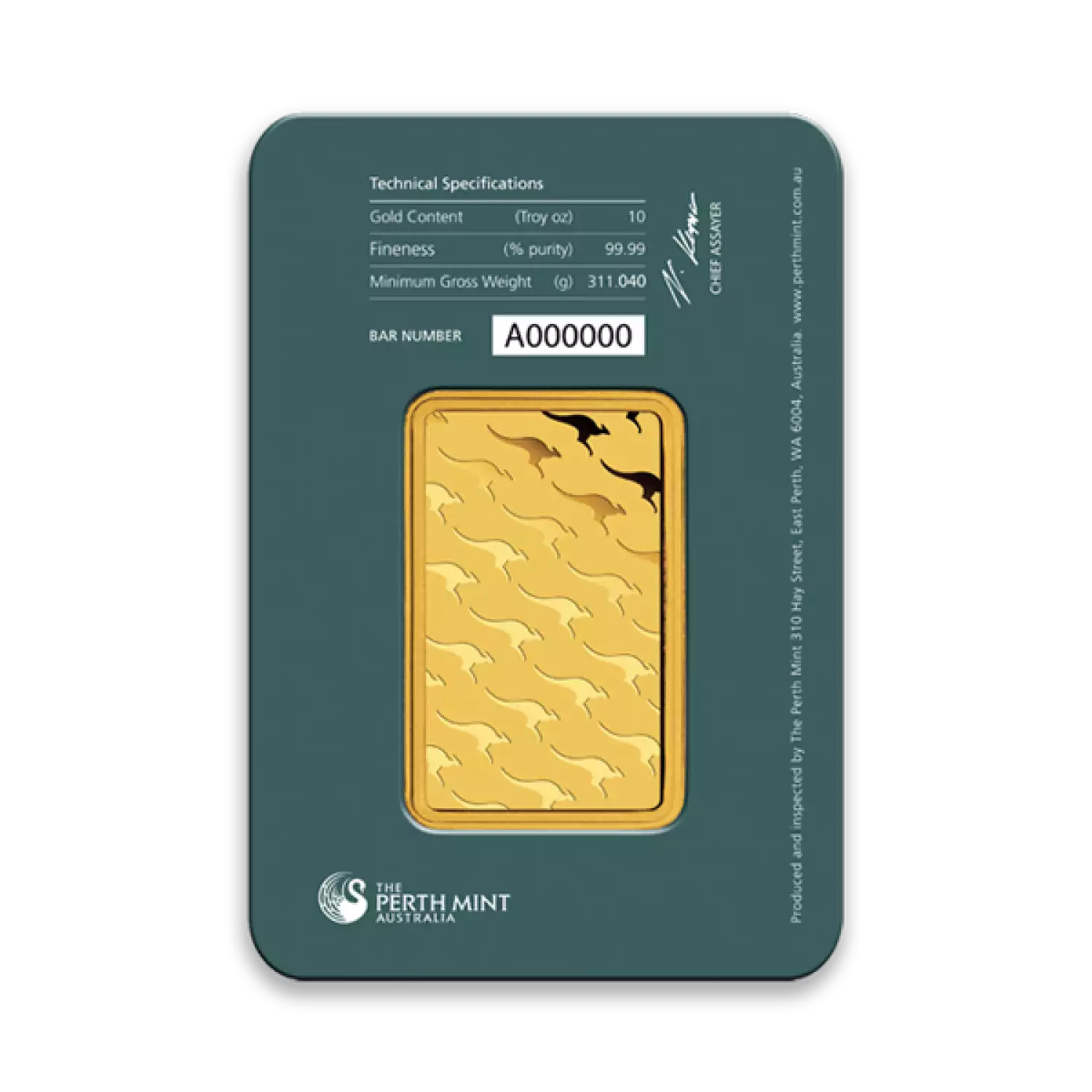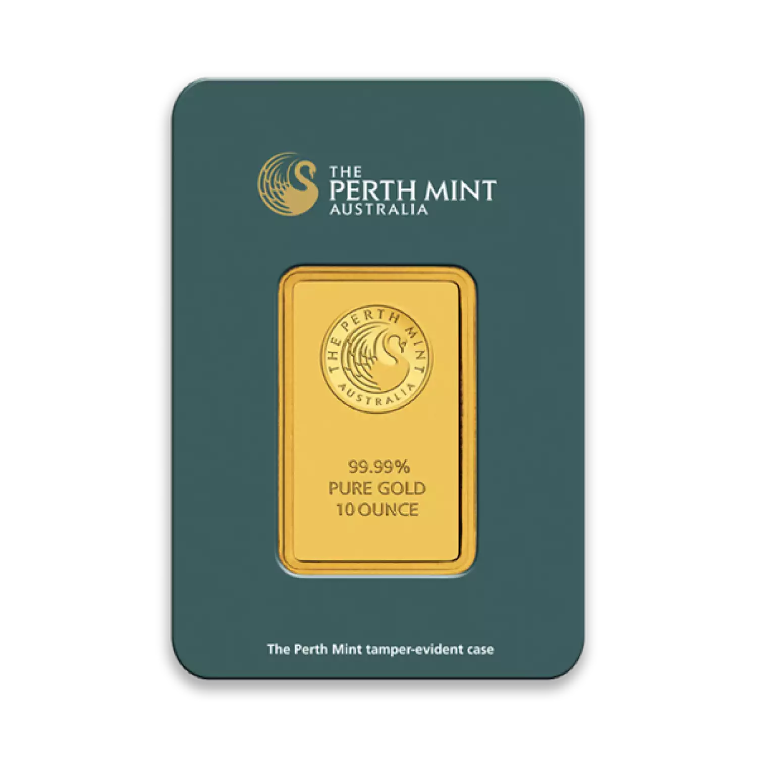 As one of the diverse bars in Australia, 10oz Australian Perth Mint gold bar – mintedappeal to investors and collectors alike. Each 10oz Australian Perth Mint gold bar – minted contains 10 troy ouncesof .9999 fine gold.A larger gold bar tends to have a lower premium per troy ounce when purchasing given the relatively fixed cost of production being absorbed into a much larger gold bar.