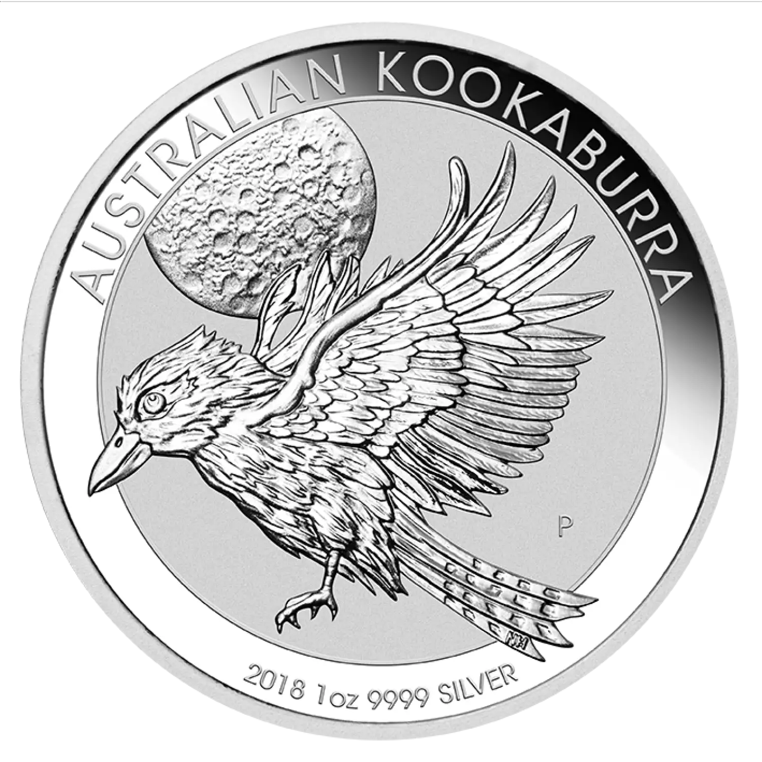 The most popular sizes when you buy silver are 1oz, 10oz, and 100oz. Many other sizes exist but those silver bar or silver round sizes are not as popular. The 2018 1oz Australian Silver Kookaburra weighs 1 troy ounce and .9999 fine silver. The reverse of each coin portrays a flying kookaburra against the backdrop of a full moon. The inscription AUSTRALIAN KOOKABURRA, The Perth Mint’s traditional ‘P’ mintmark, the 2018 year-date, and the weight and purity are also included in the design.
