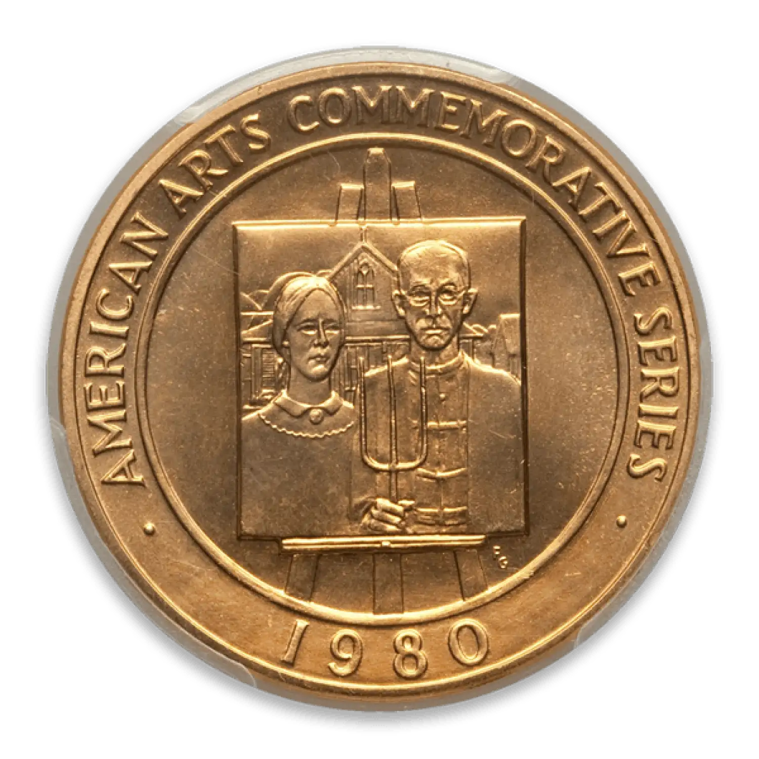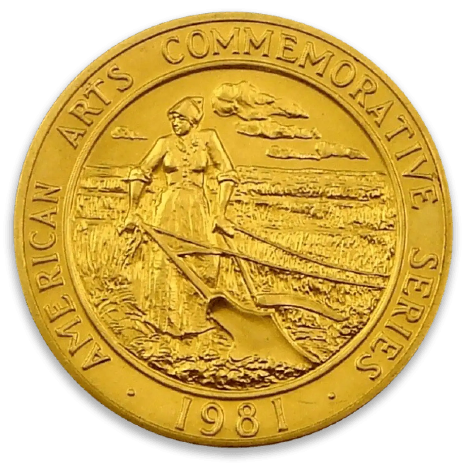 Each American Art Medallion - ½ oz is composed of 0.5 troy ounce of .900 actual gold content. The obverse of the medal features a different featured American artist each year and the reverse shows each of the artist's achievement.