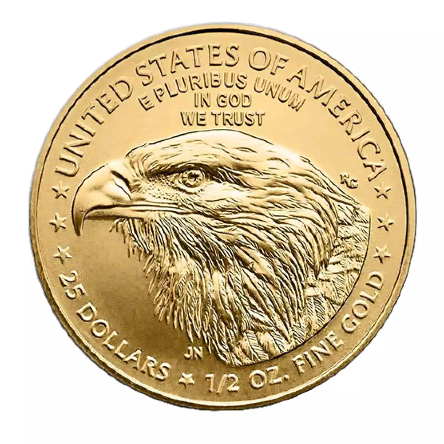 The 2023 1/2 oz American Gold Eagle is the 38th annual release of American Gold Eagle coins. This coin contains 1/2 Troy oz of actual gold content. Many precious metals investors prefer fractional gold coins (coins weighing less than one troy ounce) as they are more affordable.