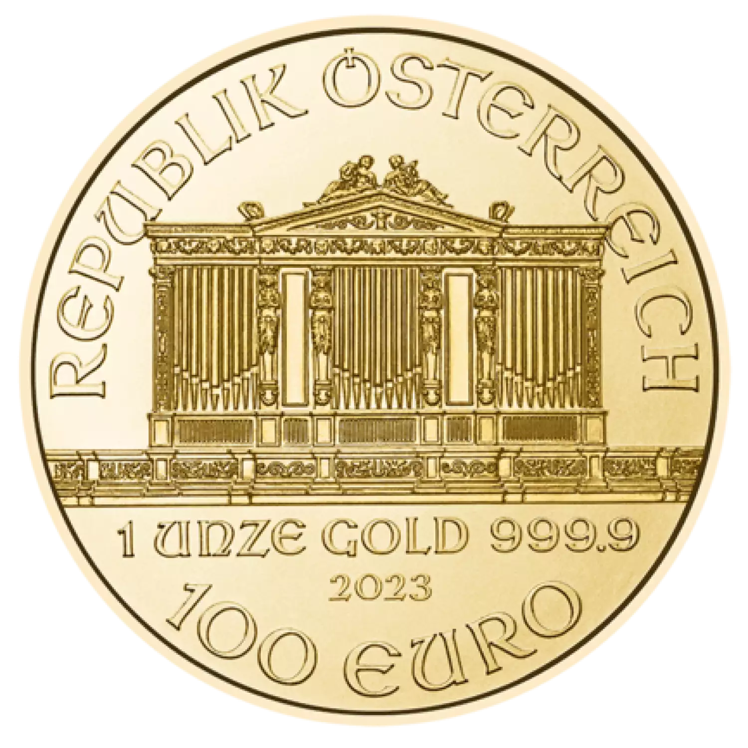The Austrian Gold Philharmonic coins are manufactured as a tribute to the renowned Vienna Philharmonic Orchestra. This series of gold coin is highly popular among investors and collectors. The 2023 1 oz Austrian Gold Philharmonic coin contains 1 oz of gold. The Reverse of the coin features an array of instruments, including the cello, violin, harp, Vienna horn and bassoon.