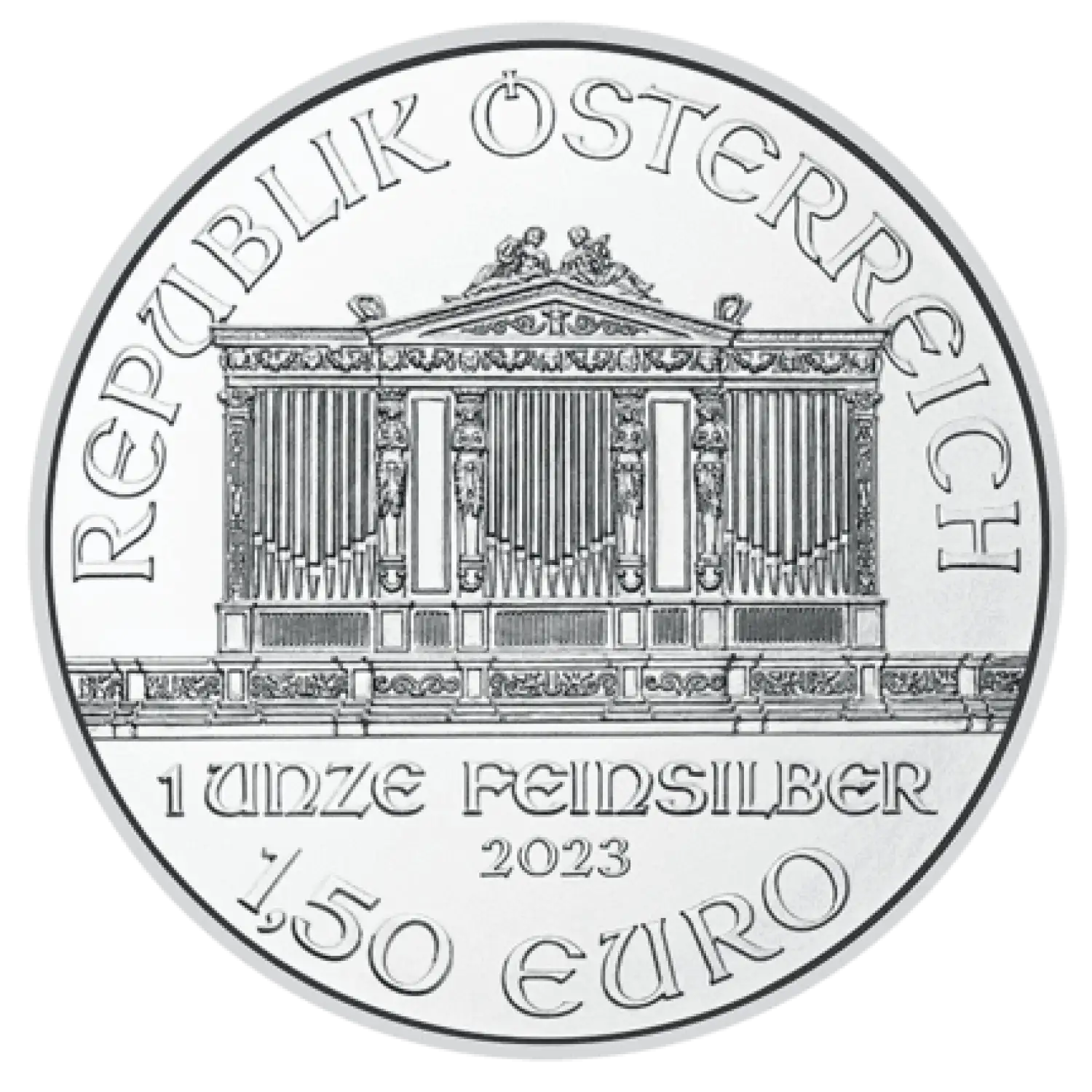 The Austrian Silver Vienna Philharmonic is a silver coin produced by the Austrian Mint. It is the most popular silver bullion coin in Europe. The coin is legal tender in Austria with a face value of 1.50 Euros. It weighs exactly 1 troy ounce of .999 fine silver. This Austrian Philharmonic silver coin has a beautiful design and is popular among all collectors and investors alike.