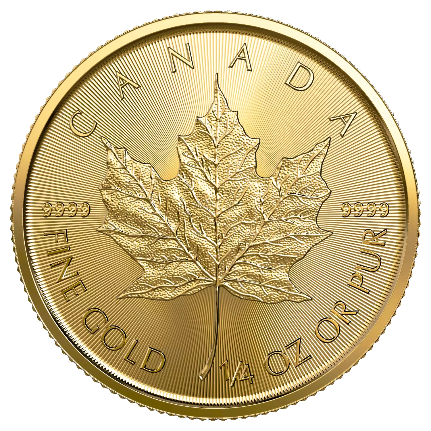 The 2023 1/4 oz Canadian Gold Maple Leaf coin contains 1/4 oz of .9999 fine Gold. The weight and purity of this coin is guaranteed by the Royal Canadian Mint. These 2023 maple leaf gold coins are highly popular among investors and collectors.