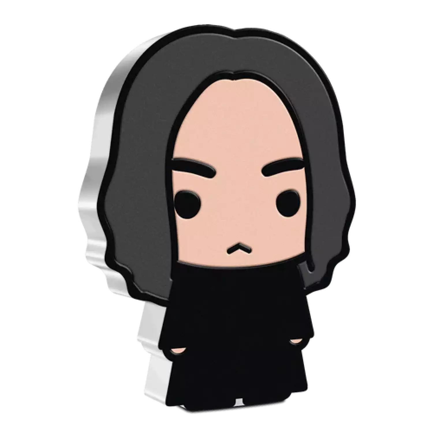 Hogwarts™ Potions Professor, SEVERUS SNAPE™, appears on this 1oz pure silver coin. It has been shaped and coloured to resemble the Dark Arts master - recognisable by his long, greasy hair, black robes and a scowl. On the obverse of the coin, you can see the Ian Rank Broadley effigy of Her Majesty Queen Elizabeth II, to confirm it as legal tender.