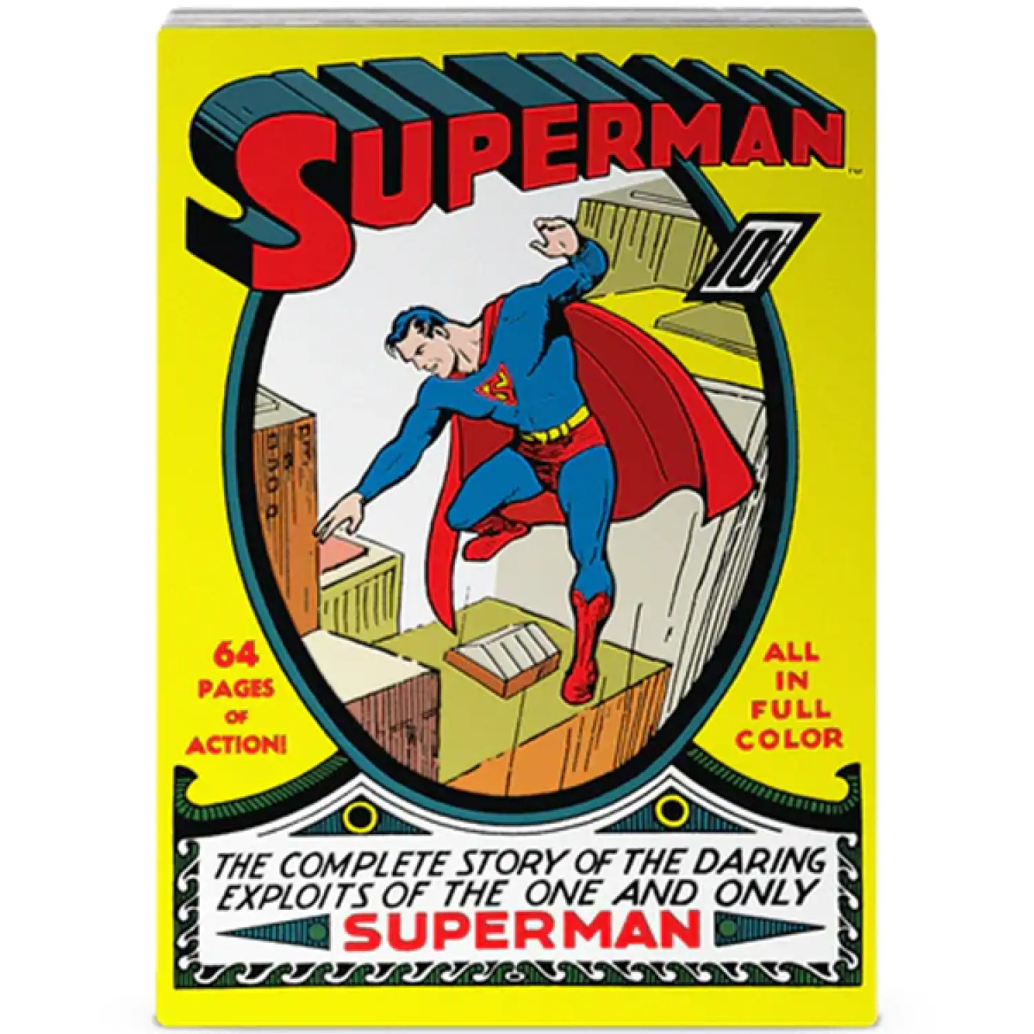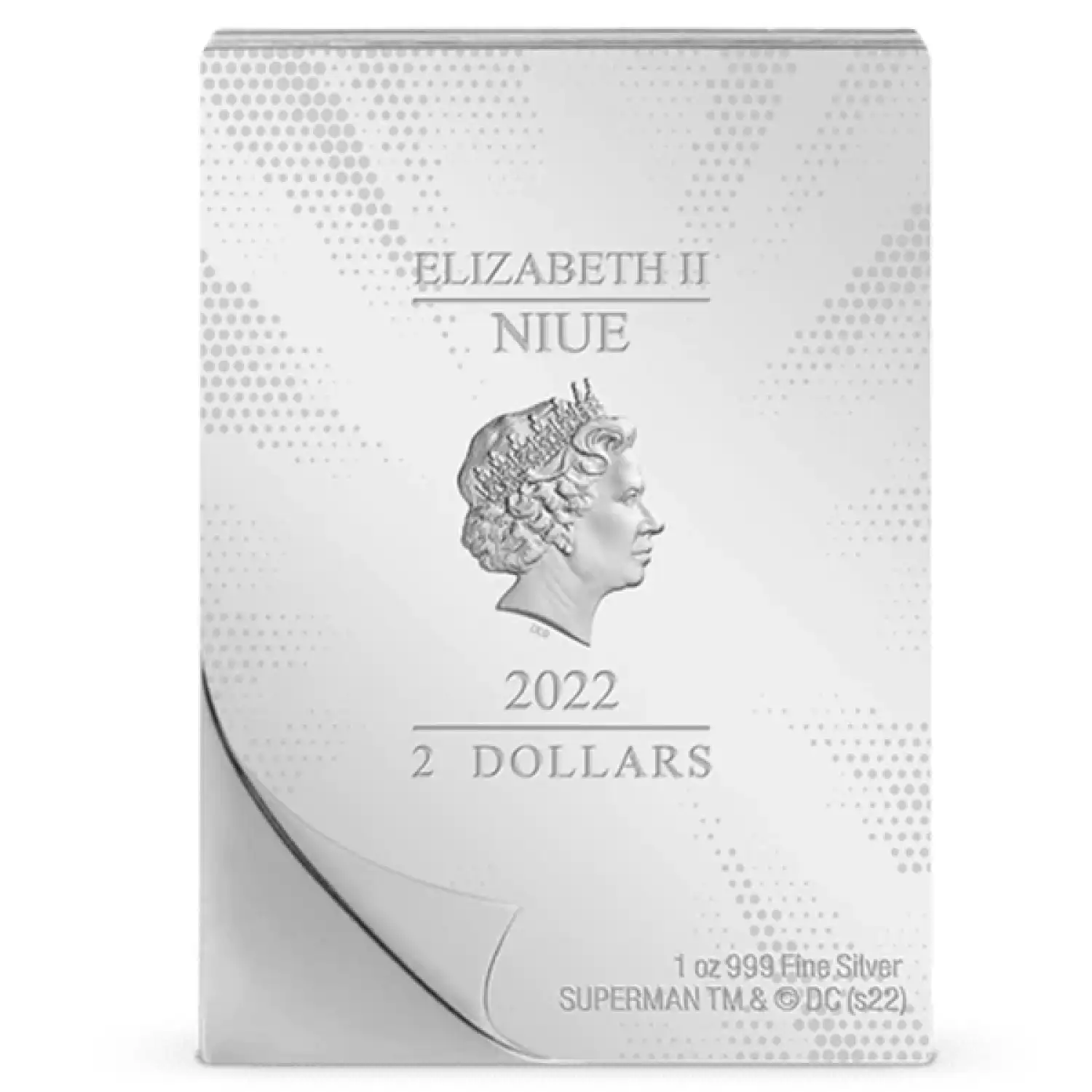 Made of 1oz pure silver, this coin displays a coloured image of not only the first self-titled comic for the MAN OF STEEL™, but for a comic book Super Hero ever. To mimic the comic book, it is crafted into a rectangular shape and coloured on all four sides to represent the spine and pages. Turn to the obverse for the effigy of Queen Elizabeth ll, confirming the coin’s legal tender. As an extra touch, a turning page has also been engraved!