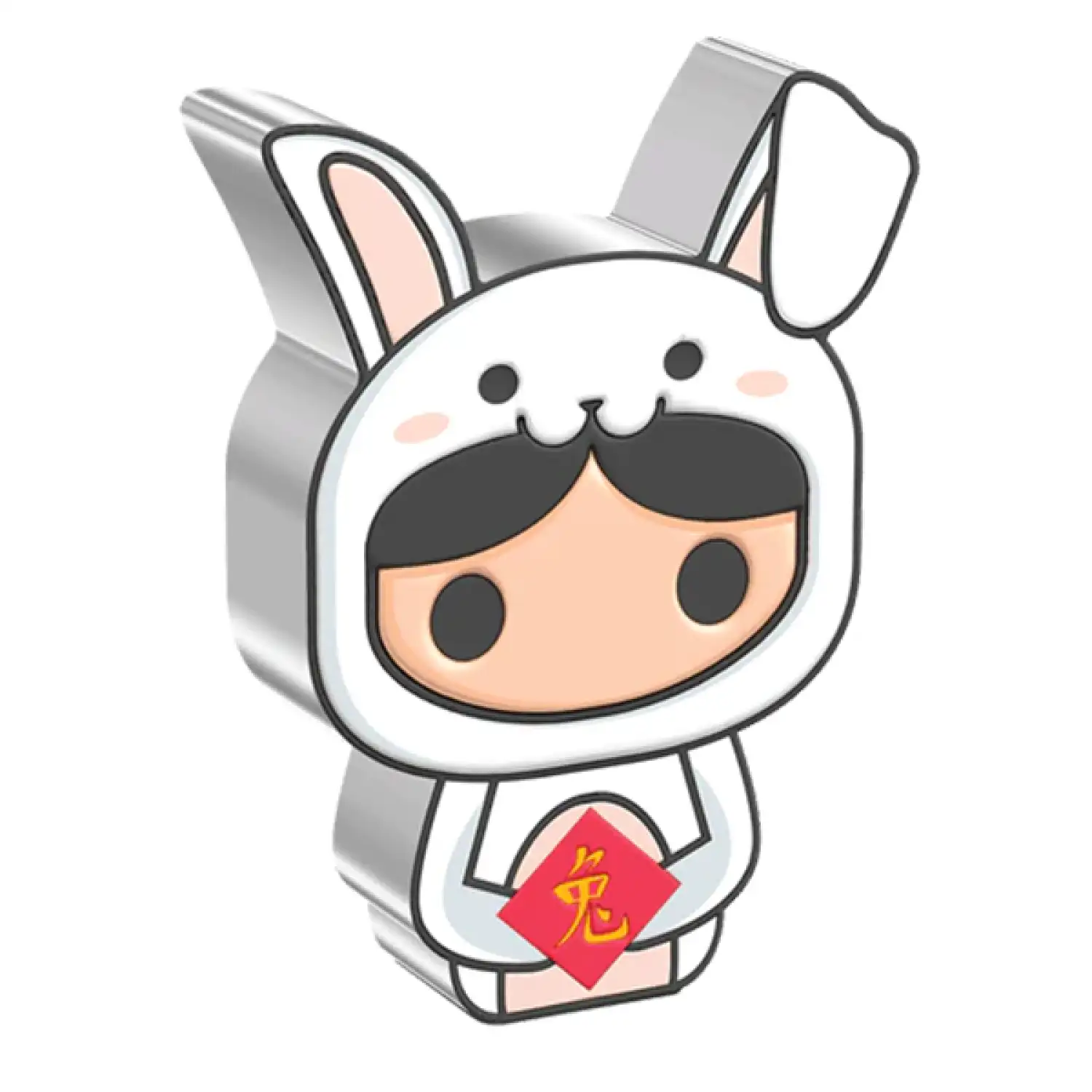 Coloured and shaped, this 1oz pure silver Chibi® Coin shows the cutest child in a rabbit costume, holding a traditional red envelope featuring the Chinese character for ‘rabbit’. Stamped on the back of the coin is the Ian Rank-Broadley effigy of Her Majesty Queen Elizabeth II, confirming it is legal tender.
