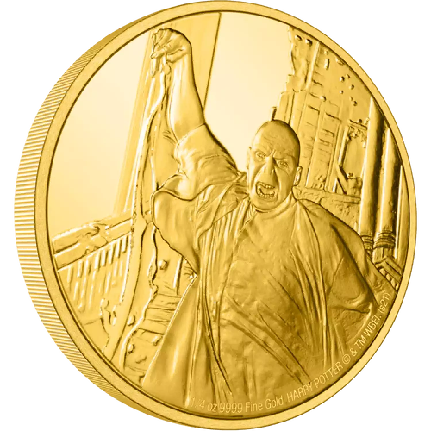 Arch enemy of Harry Potter, Lord Voldemort, features on this delicately engraved ¼ oz gold coin. It shows a menacing image of the Dark Lord casting a vicious spell in anger. The effigy of Her Majesty Queen Elizabeth II on the opposite side confirms the coin as legal tender.