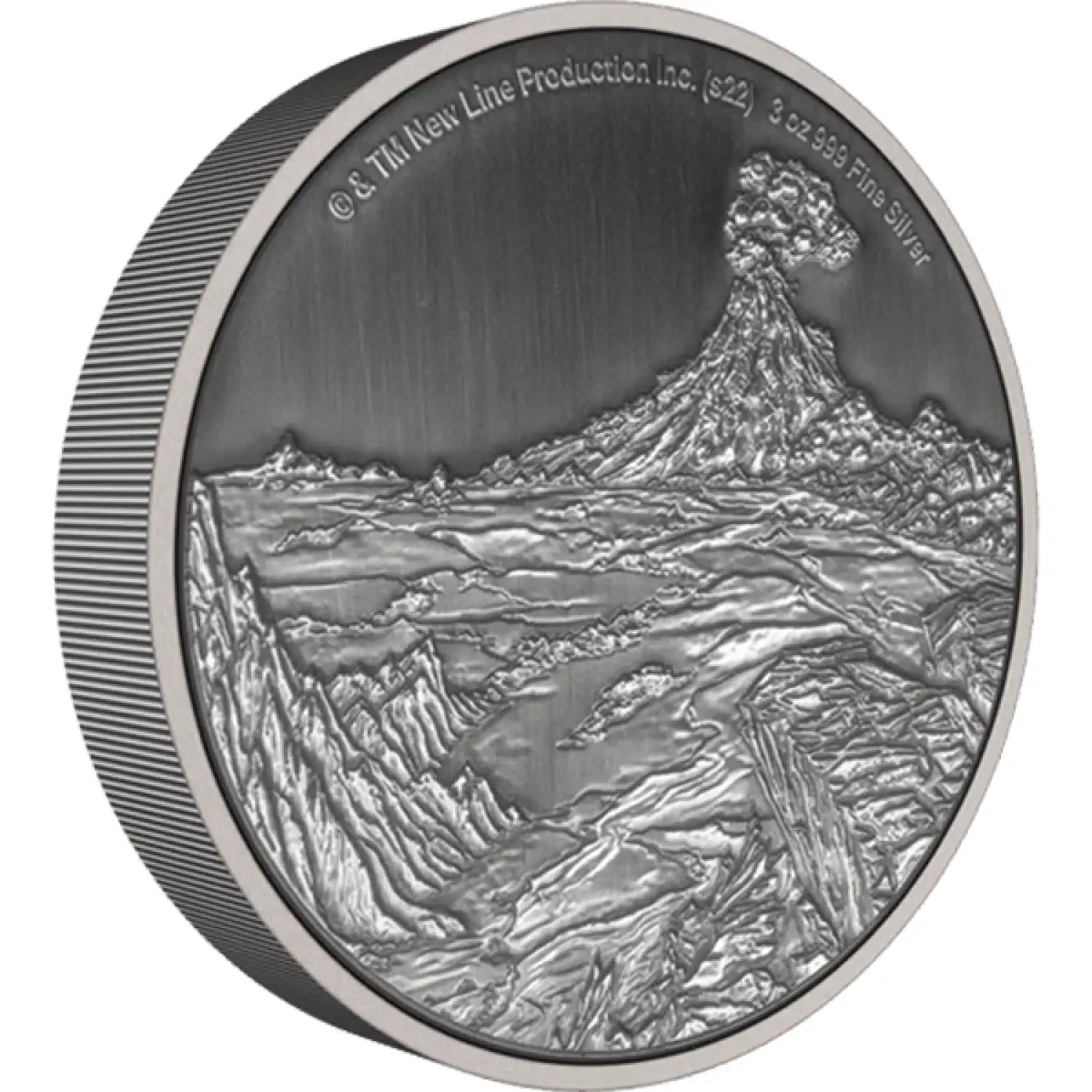 Made of 3oz pure silver, this coin shows the fiery volcano in Mordor, Mount Doom, from THE LORD OF THE RINGS™. It is fully engraved and antiqued with added relief for a truly epic design. The large 55mm diameter gives a wide view of this impressive landscape.