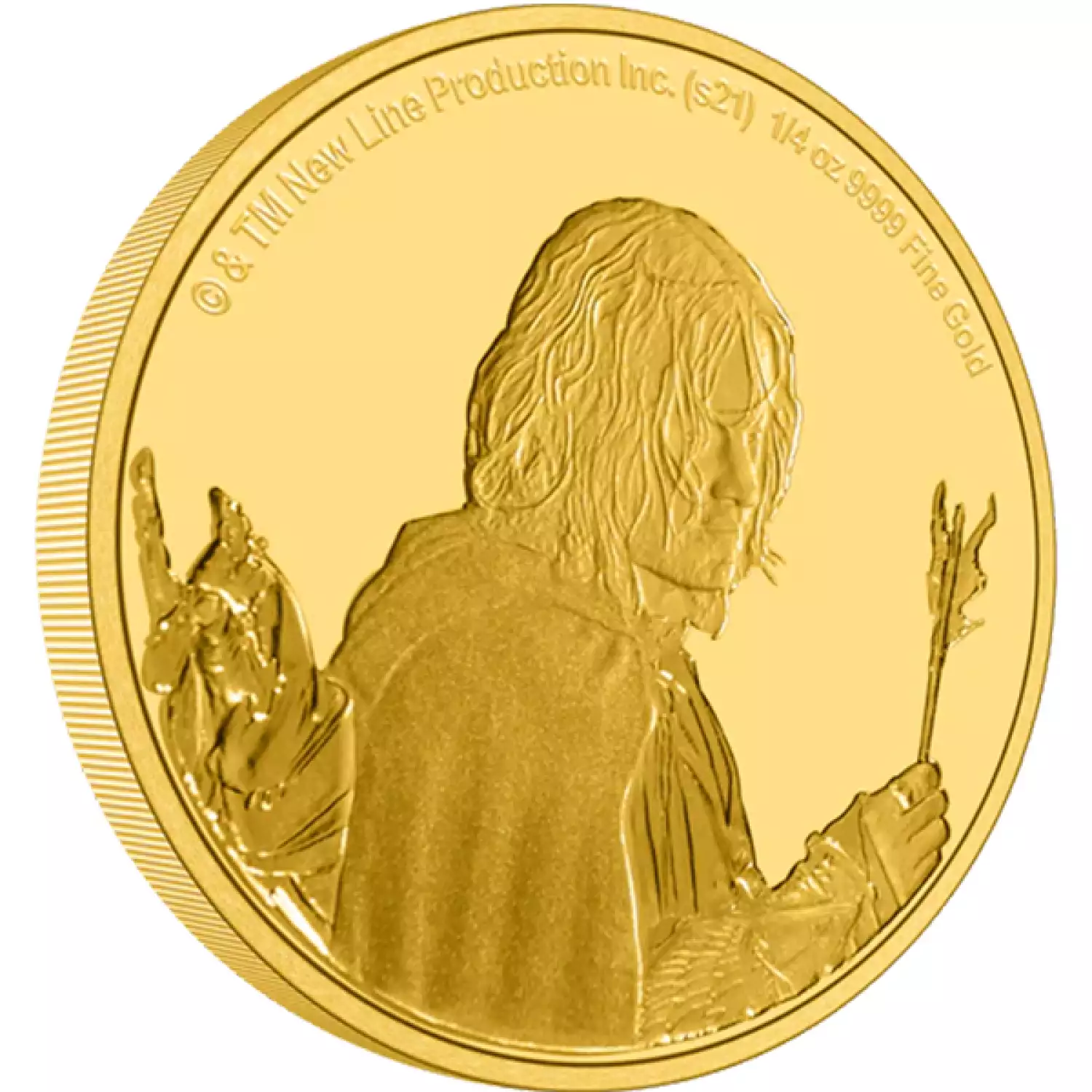 Brave leader, Aragorn, dominates this ¼ oz gold coin. On one side it shows a close-up view of warrior Aragorn with an arrow plucked from his quiver. The legal tender status of this stunning collectible coin is confirmed by Her Majesty Queen Elizabeth II effigy on the obverse side.