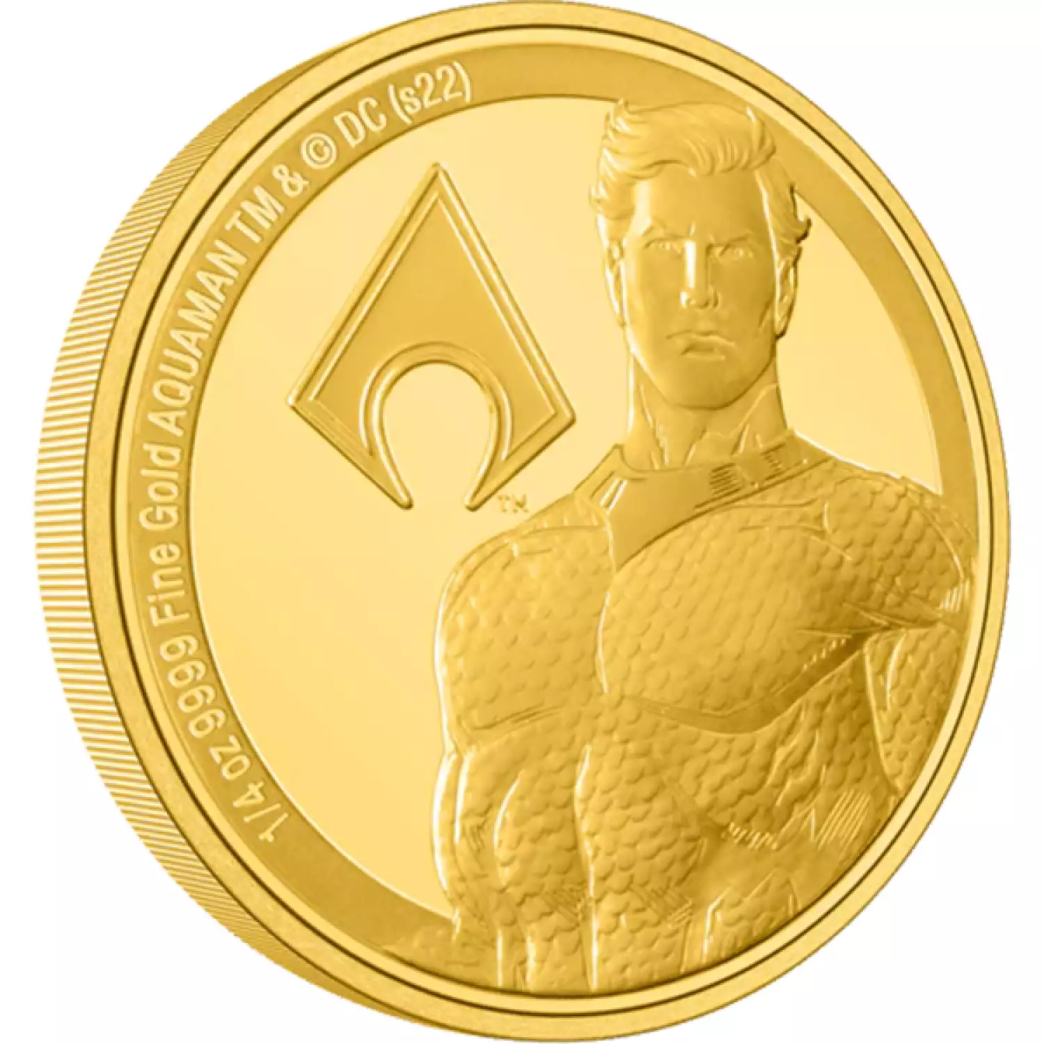 King of the Seven Seas, AQUAMAN™ stands strong on an exquisitely engraved ¼oz gold coin! The design highlights a powerful close-up of the hero, with his iconic emblem beside him. Some relief and texture, using sandblasting, further enhance the design which stands out beautifully against the mirror-finish background.
