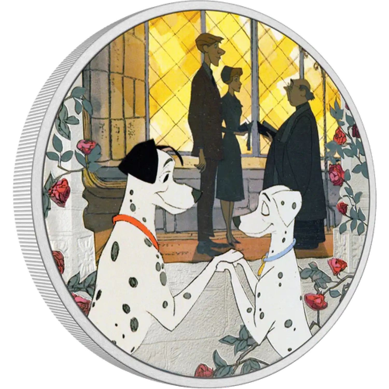 Officially licensed, this 1oz pure silver coin perfectly captures a beautiful scene from the endearing, puppy-filled film, Disney’s 101 Dalmatians. Using selective colourisation, it showcases the moment where Roger and Anita, and Pongo and Perdita, get married. The exterior of the chapel has been frosted to accentuate the silver and add contrast against the beautiful, coloured roses.