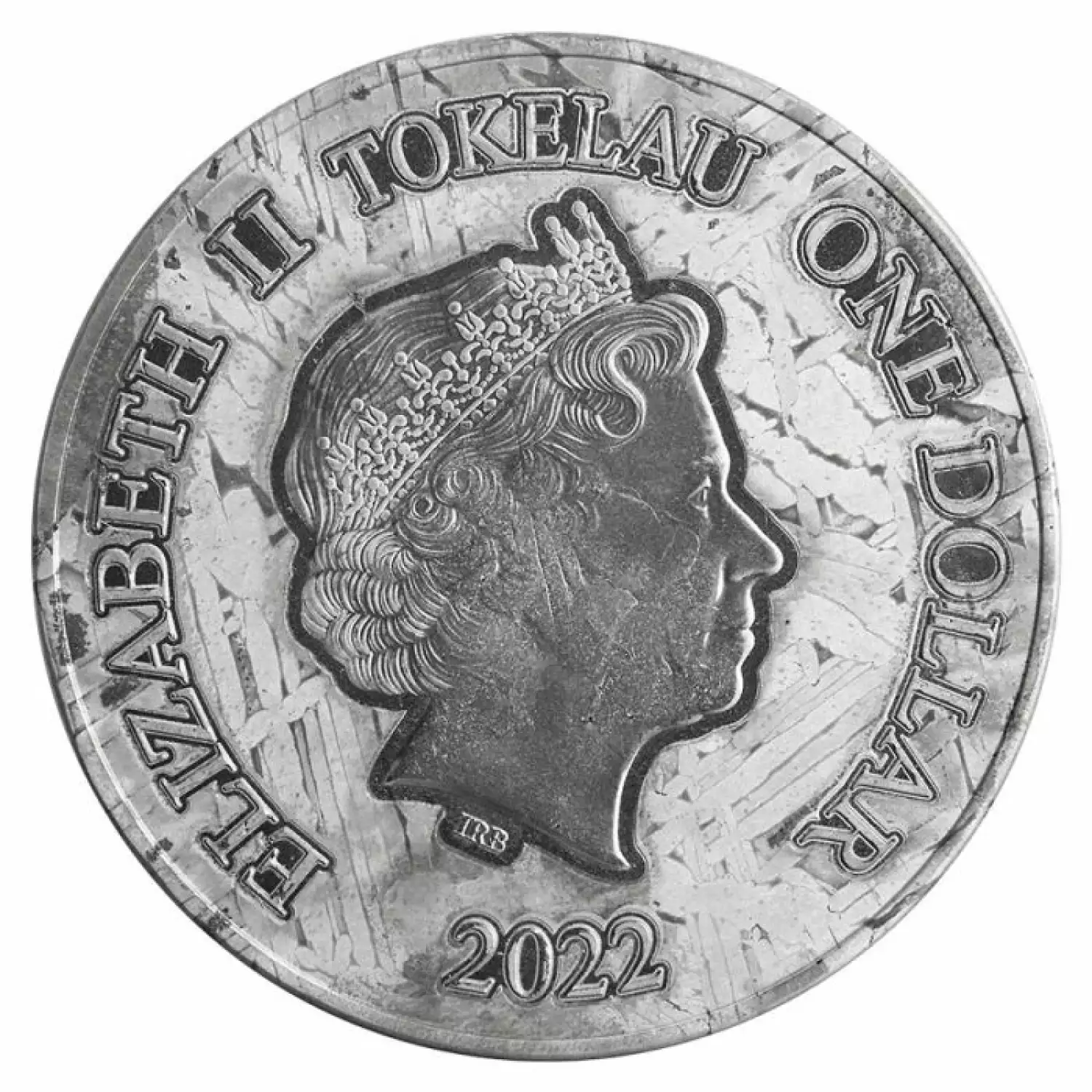 This 2022 Phoenix and Dragon coin is struck from 1 oz. of Aletai Meteorite. The 42 mm diameter coin's dramatic imagery is embellished with vibrant color. The one dollar denomination coin is legal tender of Tokelau. The coin will ship in a handsome original Mint package. In tribute to the lucky number eight in Chinese culture, mintage is limited to only 888 pieces.