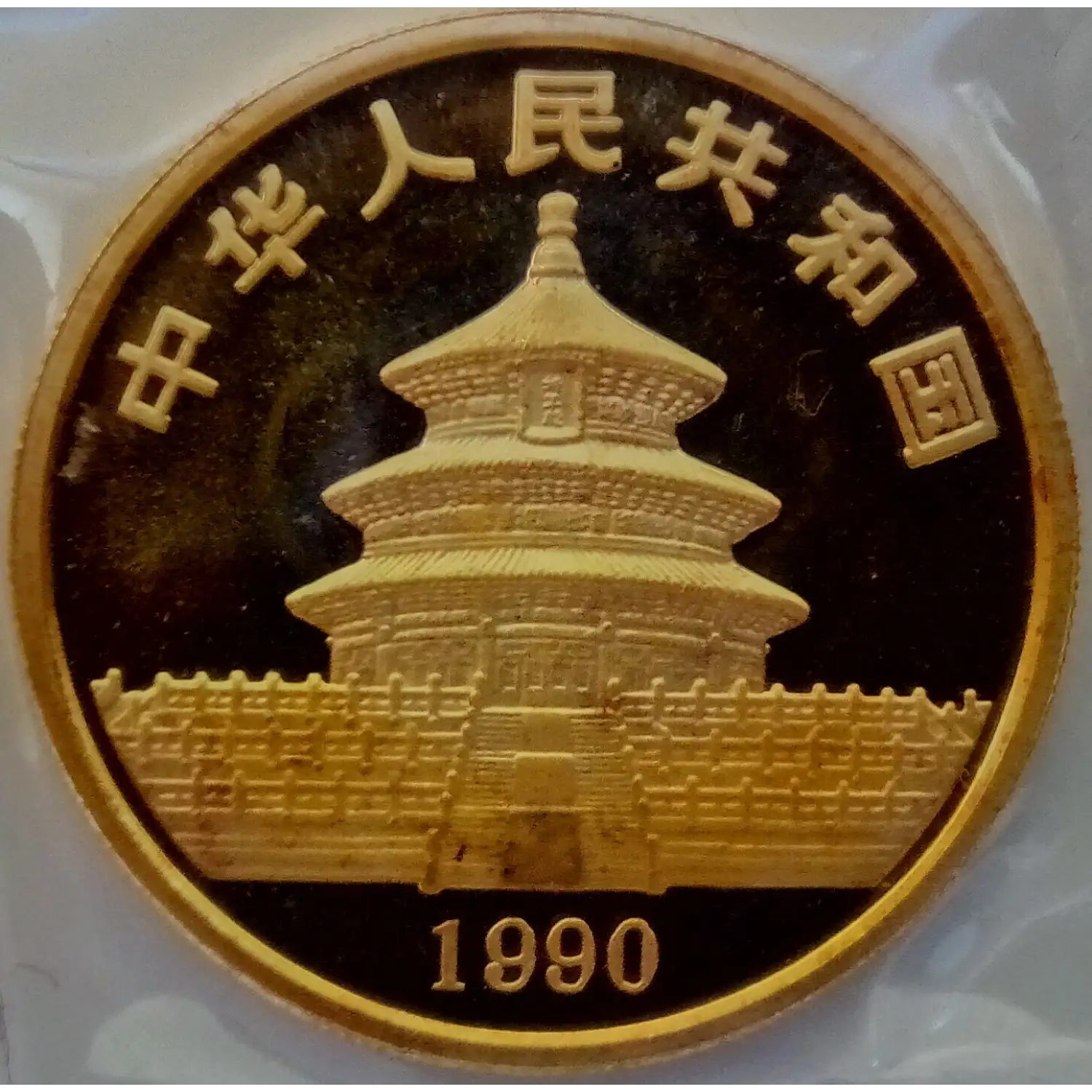 The 1990 Chinese Panda Gold coin is minted as .999 fine gold, 24 karat.