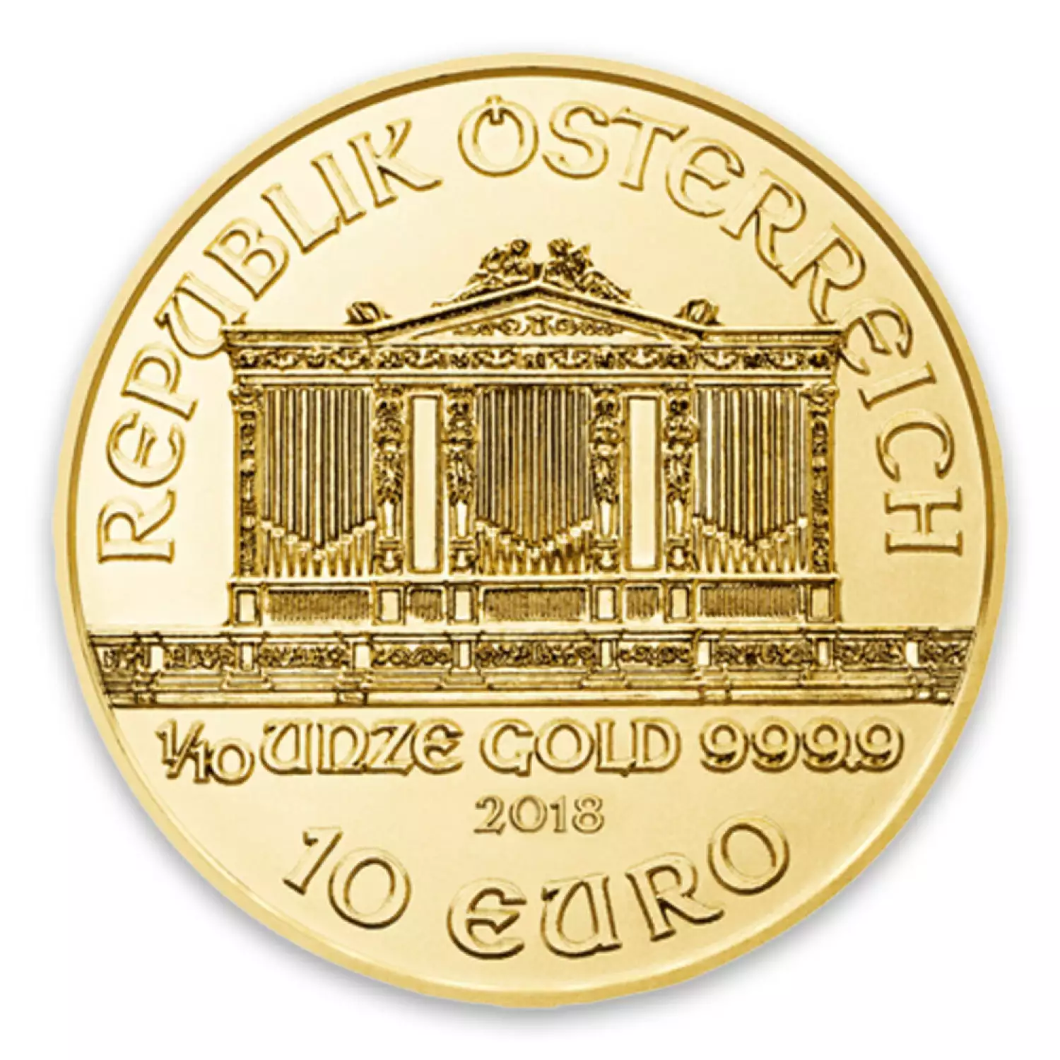 The 1/10 oz Austrian Gold Philharmonic coin contains 0.1 oz of gold. The Reverse of the 1/10 oz Austrian gold coin features the stunning image of the Great Organ of the Golden Hall, Vienna Musikverein.